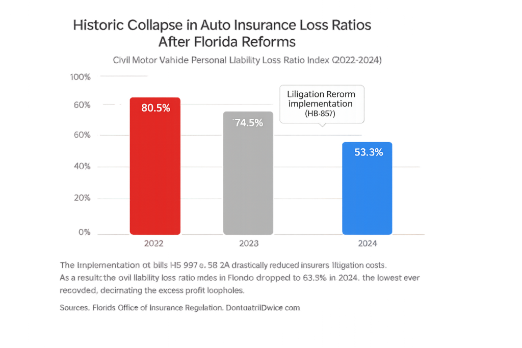 As confirmed by official records from the OIR and Commissioner Michael Yaworsky, the personal auto liability loss ratio dropped drastically from 80.5% in 2022 to 74.5% in 2023, and finally plummeted to an astonishing 53.3% in 2024. This indicator positioned Florida, which for years was the most problematic state, with the lowest loss ratio in the entire United States during that period.